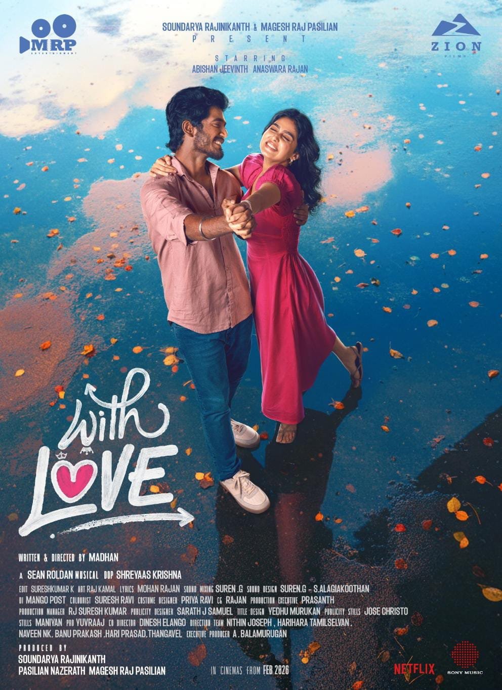 Zion Films சார்பில் சௌந்தர்யா ரஜினிகாந்த் மற்றும் MRP Entertainment இணைந்து வழங்கும், பசிலியான் நாசரேத், மகேஷ் ராஜ் பசிலியான் தயாரிப்பில், டூரிஸ்ட் ஃபேமிலி’ இயக்குநர் அபிஷன் ஜீவிந்த் மற்றும் அனஸ்வரா ராஜன் நடிப்பில் உருவாகி வரும், புதிய படத்திற்கு வித் லவ் ( With Love ) என தலைப்பிடப்பட்டுள்ளது.