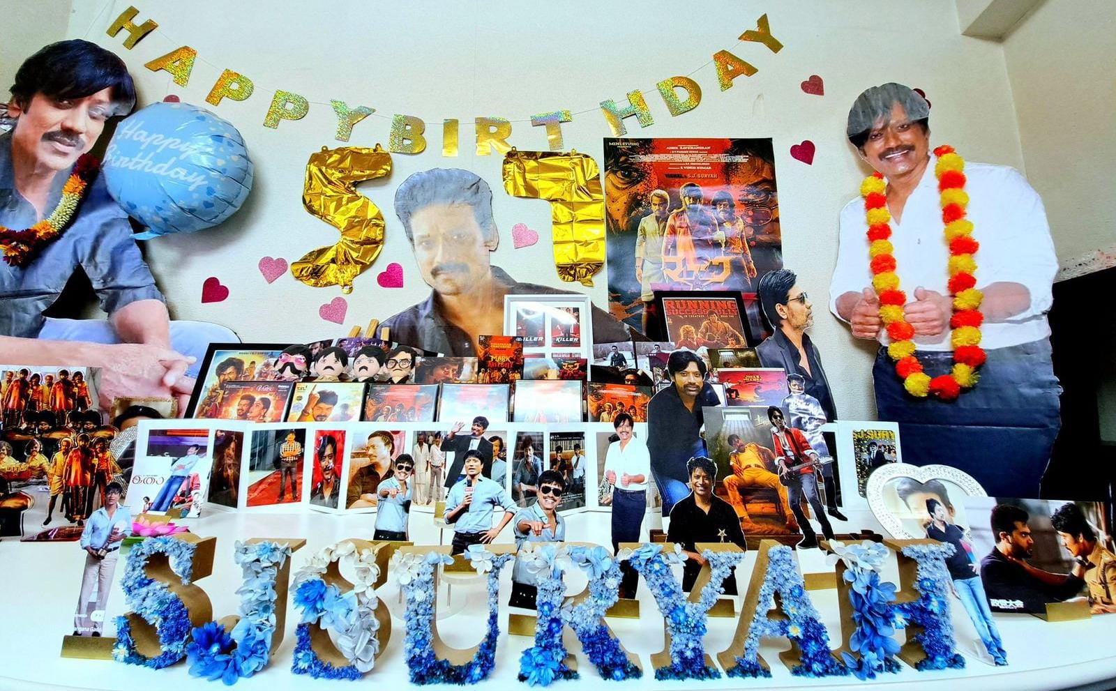 அவரது படங்களை பார்த்து ரசித்து விட்டுப் போவதுடன் நின்று விடாமல் எஸ்.ஜே சூர்யா இதுவரை நடித்த அவரது ஒவ்வொரு படங்களிலிருந்தும் அவரது புகைப்படங்கள், அவரது படங்களின் டிவிடிக்கள் அனைத்தையும் சேகரித்து, நவராத்திரி கொலு வைப்பது போல அடுக்கி வைத்து, இரண்டு புறமும் அவருடைய மினி கட் அவுட்டுகளையும் நிறுத்தி, அதற்கு மாலை போட்டு, நண்பர்கள் சகிதமாக வெகு விமர்சையாக எஸ்.ஜே சூர்யாவின் பிறந்தநாளை கொண்டாடியுள்ளார்கள். இது குறித்த புகைப்படங்கள் தற்போது சோசியல் மீடியாவில் வைரலாக பரவி வருகின்றன.