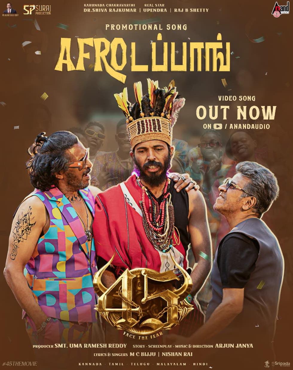 “45 தி மூவி” — கருநாட சக்கரவர்த்தி டாக்டர் சிவராஜ்குமார், ரியல் ஸ்டார் உபேந்திரா, மற்றும் இராஜ் பி ஷெட்டி நடிப்பில், அர்ஜுன் ஜன்யா இயக்கத்தில் உருவாகி வரும் பிரம்மாண்டமான திரைப்படம். சுரஜ் புரொடக்‌ஷன்ஸ் பேனரில் திருமதி உமா ரமேஷ் ரெட்டி மற்றும் எம். ரமேஷ் ரெட்டி ஆகியோர் தயாரித்துள்ள இந்த படம், அதன் போஸ்டர்கள் மற்றும் க்ளிம்ப்ஸ்கள் வெளியாகியதிலிருந்து ரசிகர்களிடையே பெரும் எதிர்பார்ப்பை ஏற்படுத்தியுள்ளது. சமீபத்தில், படக்குழு வெளியிட்ட தனித்துவமான, அதிரடி நடனப்பாடல் “ஆஃப்ரோ தபாங்” (Afro Tapang) ரசிகர்களிடையே இன்னும் அதிக உற்சாகத்தை ஏற்படுத்தியுள்ளது.