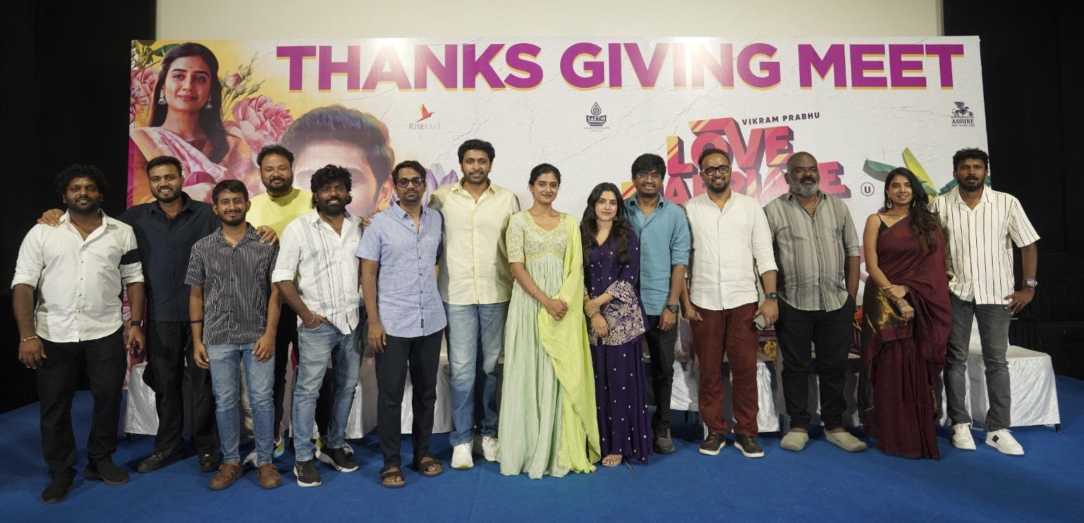 அஸ்யூர் பிலிம்ஸ் மற்றும் ரைஸ் ஈஸ்ட் என்டர்டெய்ன்மென்ட் நிறுவனத்தின் தயாரிப்பில், சக்தி பிலிம் ஃபேக்டரி வெளியீட்டில், அறிமுக இயக்குநர் சண்முகபிரியன் இயக்கத்தில் விக்ரம் பிரபு, சுஷ்மிதா பட், மீனாட்சி தினேஷ், அருள்தாஸ், ரமேஷ் திலக், முருகானந்தம் உள்ளிட்ட பலரது நடிப்பில் வெளியான ‘லவ் மேரேஜ்’ திரைப்படம் – ரசிகர்களின் பேராதரவுடன் வெற்றிகரமாக திரையரங்குகளில் ஓடிக்கொண்டிருக்கிறது. இந்நிலையில் படத்தை வெற்றி பெறச் செய்த ரசிகர்களுக்கும், ஊடகத்தினருக்கும் படக்குழுவினர் நன்றி தெரிவிக்கும் வகையில் விழா ஒன்றினை சென்னையில் ஒருங்கிணைத்திருந்தனர். இவ்விழாவில் படக் குழுவினர் உற்சாகத்துடன் கலந்து கொண்டனர்.