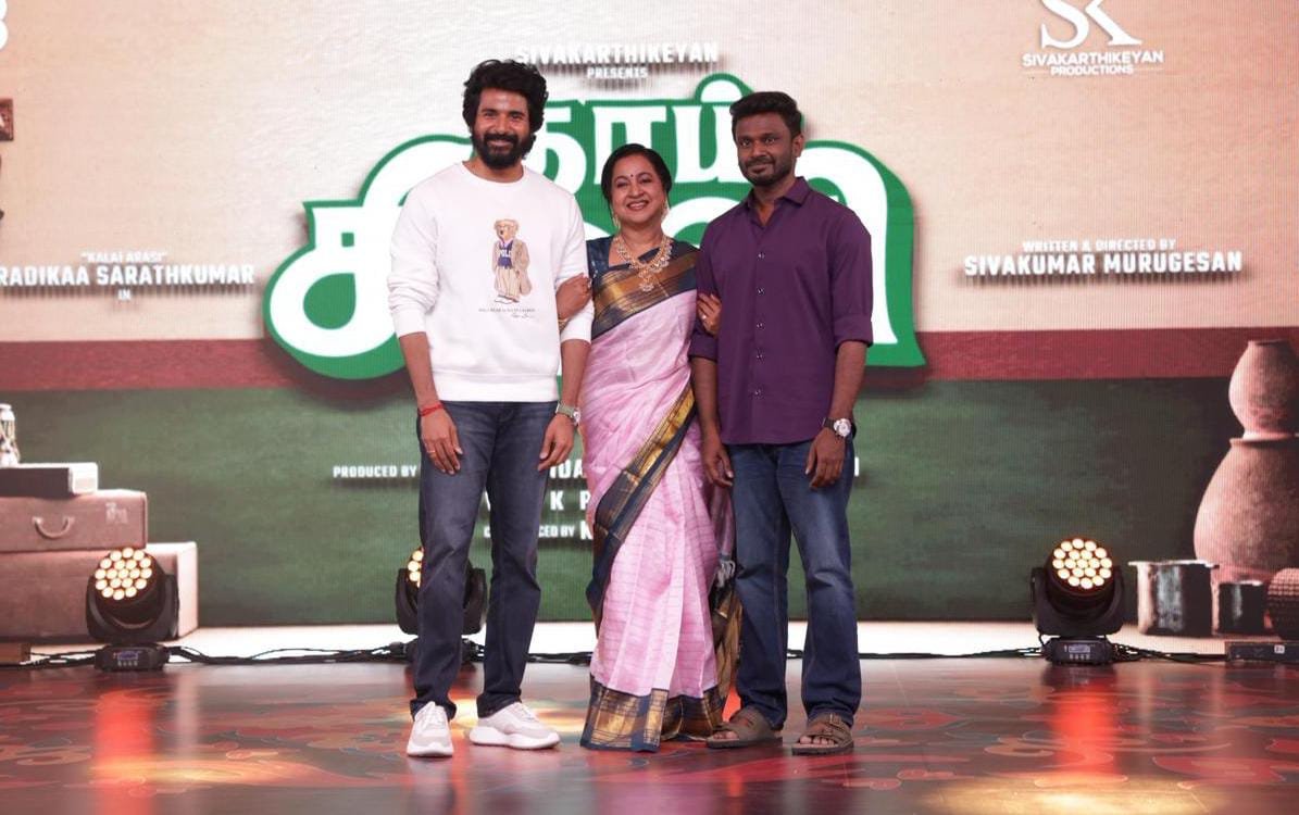 நிகழ்வில் கலந்து கொண்ட சிவகார்த்திகேயன் புரொடக்‌ஷன்ஸ் கலை, “நல்ல கதைகள் தயாரிக்க வேண்டும் என்ற நோக்கத்தோடு சிவகார்த்திகேயன் புரொடக்‌ஷன்ஸ் இயங்கி வருகிறது. இது எங்கள் தயாரிப்பில் ஒன்பதாவது படம். இந்தப் படத்தின் இயக்குநர் மற்றும் கதை மீது சிவகார்த்திகேயன் வைத்த நம்பிக்கையில் இருந்துதான் படம் தொடங்கியது. பேஷன் ஸ்டுடியோஸ் உடன் இணைந்து தயாரித்திருக்கிறோம். படத்தின் ரஃப் கட் பார்த்துவிட்டு எங்கள் அணியை சிவா பாராட்டினார். சிவகுமார் எவ்வளவு திறமையான இயக்குநர் என்பது இந்தப் படத்தின் மூலமும், அவருக்கு அடுத்து கிடைத்திருக்கும் வாய்ப்பை பார்க்கும்போதும் தெரியும். ராதிகா மேம் எங்களுக்கு மிகுந்த ஒத்துழைப்பு கொடுத்து நடித்தார். படக்குழுவினர் அனைவருக்கும் நன்றி. 27 ஆம் தேதி படம் திரையரங்குகளில் வெளியாகிறது. உங்கள் அனைவரின் ஆதரவும் தேவை”.